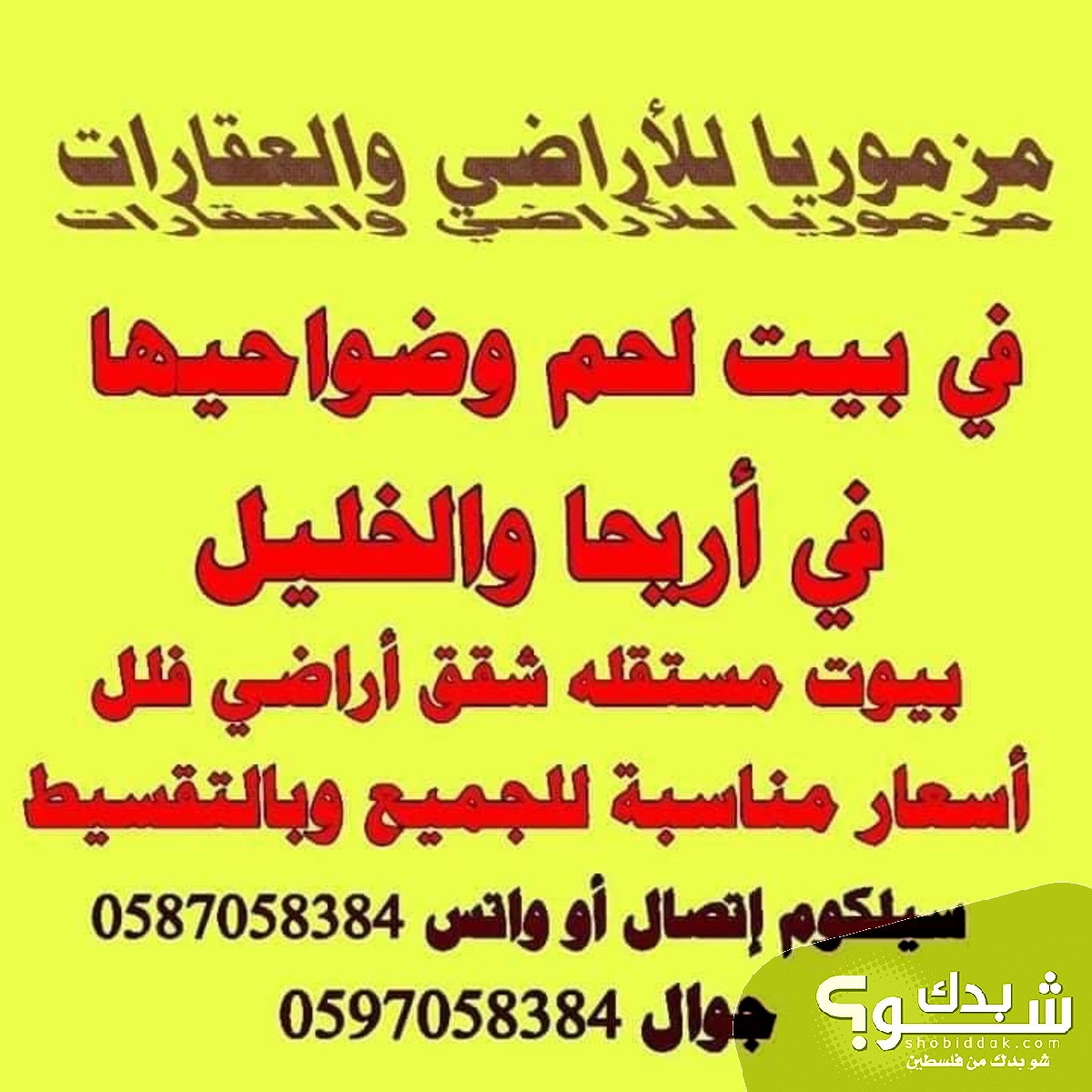 - في حالة الانشغال التواصل على الواتس اب على الرقم الاول 0587058384 مزموريا للأراضي والعقارات الخيار الأفضل لكم اهلا وسهلا بالجميع الكثير من العروض الجديده بأسعار مناسبة و بالتقسيط بما يتناسب مع أصحاب الدخل المحدود